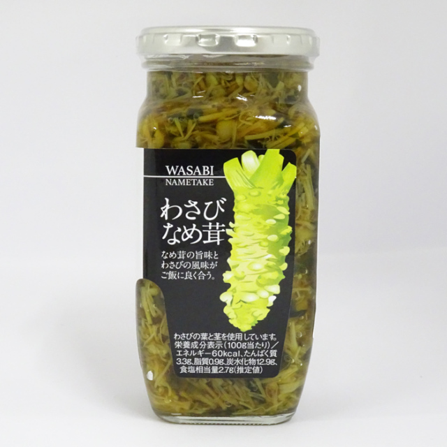 えのき茸(国産)、醤油、わさび(茎、葉、花)、ぶどう糖果糖液糖、砂糖、鰹だし、水飴、寒天 / 調味料(アミノ酸等)、増粘多糖類、酸味料、香料、香辛料抽出物、着色料(黄4、青1、銅葉緑素)、(一部に小麦・大豆・ゼラチンを含む)