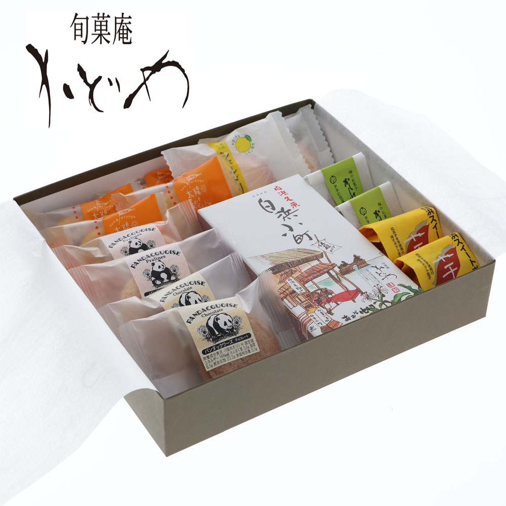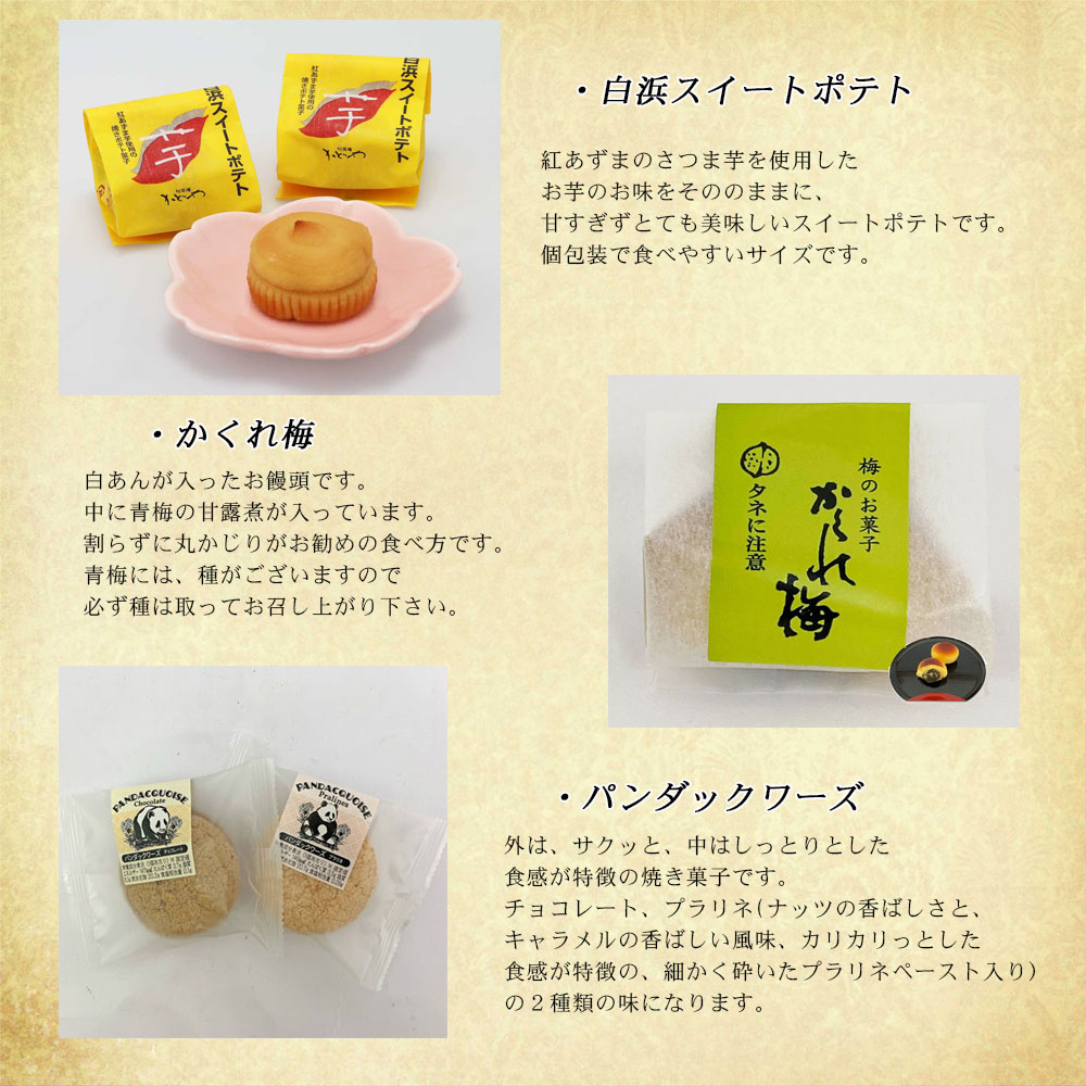 白浜小町(5個)、太陽とおらんじゅ(4個)、シェルドリーム(2個)、白浜スイートポテト(2個)、かくれ梅(2個)、パンダックワーズ(プラリネ2個、チョコレート2個)合計19個入
